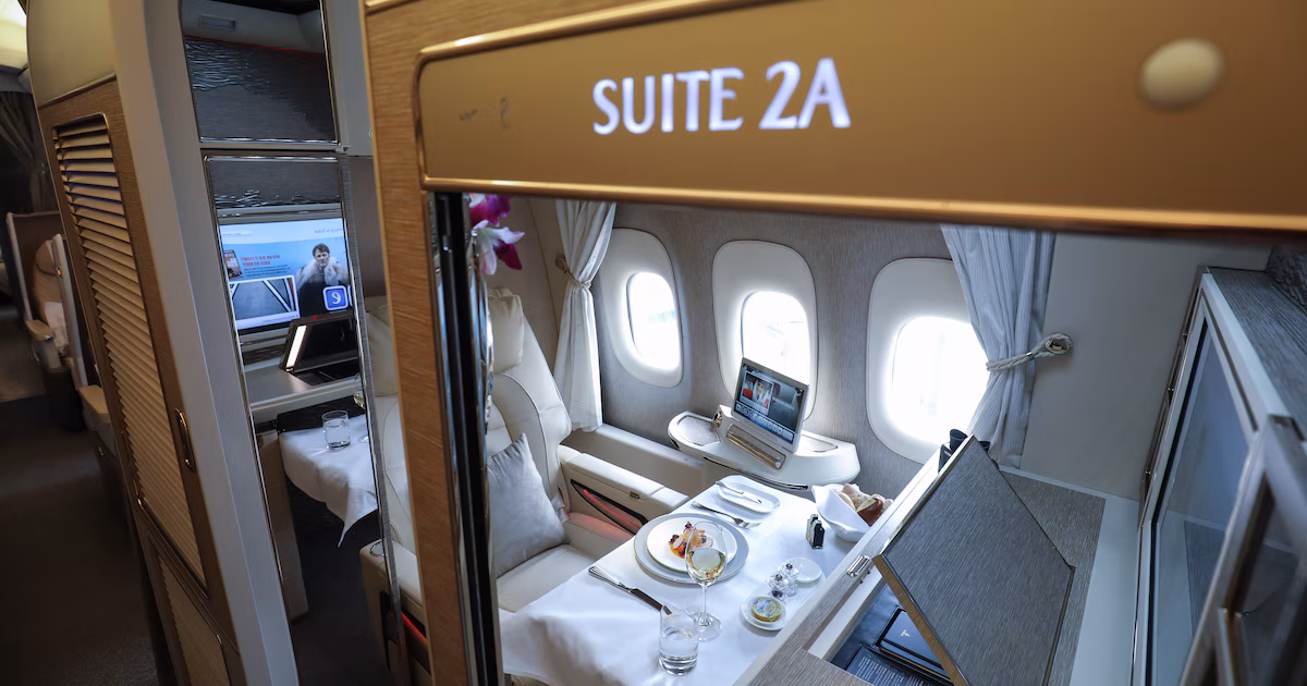 Des cabines privées de luxe sont déjà présentes sur tous les Airbus A380 et la plupart des Boeing 777 d’Emirates. Les passagers de première classe peuvent s’y détendre confortablement, un verre de champagne à la main, dans une suite privée parfois dotée de portes coulissantes pouvant rester entrouvertes ou se fermer complètement.
