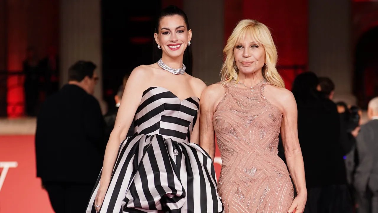 À l’occasion de l’avant-première du Diable s’habille en Prada 2, Anne Hathaway était au bras de Donatella Versace à Londres. Prada, Chanel, Schiaparelli, Valentino et Versace… La campagne promotionnelle du film est un véritable phénomène de mode. Vingt ans après la sortie du premier opus, ce tapis rouge est une opportunité pour les stars de se présenter dans des créations plus nombreuses et spectaculaires que jamais… Pas une mais deux robes ! L’actrice américaine et la créatrice italienne ont changé de look avant de rejoindre la National Gallery. Plus élégantes que jamais, Anne Hathaway et Donatella Versace ont commencé la soirée avec des silhouettes longues noires bustiers, signées Versace… Evidemment ! Elles ont poursuivi la nuit habillées respectivement d’une robe à rayures imposantes, et d’une silhouette sirène rose poudré.